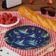 Teller in einem urlaubsszenario mit schneebedeckten Evergreens, Reh und Schneeflocken auf tiefblauem Hintergrund