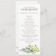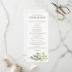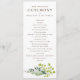 Elegantes Hochzeitsprogramm, Flachkarte mit bearbeitbarem Titel und Text. Original handgezeichneter Grünrahmen von Junghaarfernn, Pfefferbaum Blätter und silberne Dollar Eukalyptus. (Passen Sie die Hintergrundfarbe Ihrer Wahl an); Originalbild von Becky Nimoy.