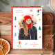Festliche Urlaubskarte mit ihrem gewölbten Foto, umgeben von bunten Skifahrern, Sternen und Pinien. Personalisieren Sie die Vorderseite der Weihnachtskarte mit Ihrem persönlichen Gruß (derzeit als "Frohe Weihnachten" angezeigt), Familienname und Jahr in roter Schrift. Die skizzenhafte Urlaubskarte kehrt zu einem roten und weißen Schneeballmuster zurück.