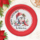 Diese festlichen Teller in Rot und Weiß mit einem niedlichen Pinguin, einem winzigen Schneemann und festlichem Grün sind mit einem fröhlichen Weihnachtsfest-Sprichwort und einer Vorlage für Ihren Familiennamen ausgestattet, um sie für das Weihnachtsfest zu personalisieren. Das Design ist optimiert für Rundpapier-Teller, sodass Sie für andere Formen und Größen das Layout anpassen müssen.