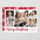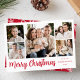 Moderne Urlaubsfotokarte mit 5 Fotos, die in einer Collage angeordnet sind. Ihr persönlicher Gruß wird in einem eleganten roten Skript mit Ihrem Familiennamen angezeigt und das Jahr rechts angezeigt. Die Karte kehrt um, um ein rotes und weißes Schneeflockenmuster anzuzeigen.
