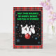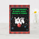 This festive holiday bowling greeting card features bowling pins with red glitter and a red bowling ball with snowflakes pattern on a cheerful red plaid background the perfect design to spread seasonal fun and holiday cheer.