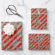 A festive rustic kraft vintage looking holiday wrapping paper sheet trio featuring red wide stripes with pine and spruce tree branches and pine cones painted in watercolors in three different scaled sizes.