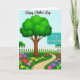 Designed with a sunny garden scene, the card features a broad, branching tree with dense emerald leaves and a sturdy brown trunk anchoring the lower area. A winding stone path of irregular warm-beige pavers starts near the lower right and leads the eye inward, like a gentle walk two friends might take side by side ❤️. Thick green grass surrounds the path, and clusters of stylized flowers in fuchsia, violet, scarlet, and yellow fill the foreground with a soft, affectionate energy 🌼. A crisp white picket fence runs across the middle, separating the flower beds from rounded green bushes under a clear blue sky. A small bright-blue bird with an orange beak perches on the fence, adding a light, companionable touch. The main message appears in flowing lettering near the upper portion, while a teal plaque-style shape nearby holds smaller words in white. The teal plaque sits toward the right side above the fence line, framed by blossoms and leafy greenery.