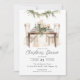 Unsere Einladung zum Weihnachtsessen beinhaltet einen eleganten Tisch mit Kerzen und grüner Garage mit dem Sprichwort "eat, drink & be merry" Die Einladung ist einfach und elegant, mit weißem Hintergrund und schwarzem Text.