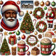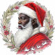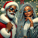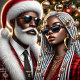 Der Weihnachtsmann und ein Begleiter sind bereit zu feiern, beide mit stilvollen Weihnachtsmotiven. Sie stehen vor einem Hintergrund von Urlaubsleuchten und Dekorationen, bereit für eine festliche Ansammlung.