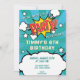 Invitation de la fête avec une typographie de style bande dessinée de "PARTY !". Cela inclut des éléments de bleu, d'orange, de jaune et de rouge, des explosions de bandes dessinées, des étoiles, et des arrière - plans d'étoiles éclatées.