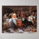 Ce tableau est dans la Collection Wallace à Londres. Il montre une fête pour célébrer l'arrivée d'un nouveau-né. Au milieu, un père tient son nouveau-né. Sur la gauche, la mère s'allonge dans son lit (sous le couvert en haut à gauche). Les amis et la famille entourent le père et le bébé. La scène est chaotique mais heureuse. Les gens s'adonnent à toutes sortes d'activités, boules, casseroles, assiettes, coquillages d'oeufs et nourriture sont éparpillés dans toute la salle. Au premier plan, une bonne est montrée de l'arrière. Elle est habillée de couleurs joyeuses et tient une chaise rouge pour que le père puisse s'asseoir. La femme debout sur le côté droit (de notre point de vue) du père recevra un peu d'argent du père qui met sa main gauche dans un sac-monnaie. Au premier plan droit, une femme souriante brille dans un grand pot et tient la main pour recevoir de l'argent. Une autre femme l'aide à verser du sucre dans la marmite. La bonne à droite reçoit une saucisse suspendue à la cheminée. A gauche, deux personnes font attention à la mère, et l'une d'elles lui nourrit de la soupe. À gauche de la table, une femme enceinte est assise à côté d'un lit d'enfant. Elle tient un verre dans sa main gauche et cache son ventre avec un tablier blanc. Des informations plus détaillées sur ce tableau peuvent être trouvées à l'adresse https://www.tripimprover.com/blog/celebrating-the-birth-by-jan-steen.