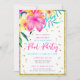 Faites un brin tropical avec cette invitation à la Pool Party fleurie et colorée ! Il présente des hibiscus tropicaux lumineux et des fleurs d'île, ainsi que des arômes de confettis et des bordures de parties scintillant. Customisez facilement avec vos informations d'événement. Le dos a des fleurs d'île assorties et des rayures de parties scintillant d'or.