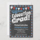Une invitation amusante et unique à la fête de remise de diplômes d'éducation dans le style tableau de bord avec des drapeaux rouges, blancs et bleus et une bordure en pois blanc avec des points à l'arrière.