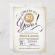 Invitation pour une fête des 50 ans de mariage. Design élégant avec un faux effet de feuille d'or et un blanc crémeux rétro. Caractéristiques d'une typographie élégante avec une police script. À 50 ans, on trinque ! Peut être personnalisé pour n'importe quelle année. Veuillez m'envoyer un message si vous avez besoin d'une personnalisation supplémentaire.
