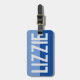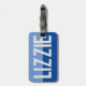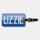 Gepäckanhänger mit Vorname. Lassen Sie Ihre Wahl des Namens kühn auf einem zweifarbigen Gepäckanhänger dargestellt. Beispiel zeigt den Namen Lizzie. Personalisieren Sie Ihre Auswahl an kurzen Namen.