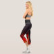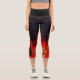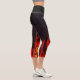Schwarze, enge Hosen mit einem Design von Feuerschwärmen am unteren Rand. Die Flammen sind rot, die Farbe der Hose ist schwarz. Das verleiht den Farben eine Anziehungskraft.