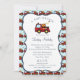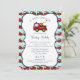 Roter Motor, Baby Dusche Einladung mit Feuerwehrwagen-Design in Rot und Blau mit Registrierungsinformationen auf der Rückseite.