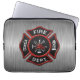 Rotes Logo-Abzeichen der Feuerwehr auf dem gebürsteten Metall, das Beschaffenheitsdruckhintergrund schaut. Groß für Feuerwehrmänner und erste Antwortende.