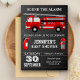 Erleben Sie die coole Babydusche mit einem schönen Feuerwehrwagen und niedlichen Brandschutzausrüstungen vor einem Kalkboard-Hintergrund. Fügen Sie einfach Ihre Veranstaltungsdetails zu dieser einfach zu bedienenden Vorlage hinzu, um sie zu einer einmaligen Einladung zu machen. Dreh die Karte auf, um ein elegantes Schwarz-Rot-Streifen-Muster auf der Kartenrückseite zu erkennen.