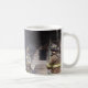 Eine Kaffee-Tasse mit einem Foto von Feuerwehrleuten, die gegen ein Hausfeuer kämpfen.