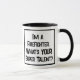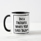 Ein lustiger Slogan auf einer Tasse, die sagt: "Ich bin Feuerwehrmann. Was ist DEIN super Talent?" Zwei Tone Tasse für einen Feuerwehrmann oder Feuerwehrmann. Schwarzweißtext.