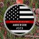 Personalisiertes Thin Red Line Ornament - Amerikanische Flagge in Firefighter Flag Farben, modernes schwarz rotes Design. Personalisieren Sie Ihre Daten mit dem Namen des Feuerwehrmanns oder der Feuerwehr. Dieses personalisierte Feuerwehrschmuck eignet sich hervorragend für Feuerwehr, Feuerwehr oder als Denkmalpflege und Feuerwehr Weihnachtsgeschenke oder kleine Geschenke. Bestellen Sie diese Feuerwehrschmuck Großhandel für Geschenke der Feuerakademie oder Feuerwehr, Feuerwehrfeuertreuen kleine Geschenke. COPYRIGHT © 2020 Judy Burrows, Black Dog Art - Alle Rechte vorbehalten. Feuerwehrmann Personalisierter Feuerwehrmann Rot Linie Metallverzierung
