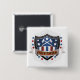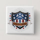 Feuerwehrmann-Wappen mit gekreuzten feuerbekämpfenden Äxten gegen ein rotes, weißes und blaues patriotisches Wappen! Spielen Sie Stoßhintergrund mit dem Umgeben der roten und blauen Sterne die Hauptrolle! Feuerwehrmanfahne, vervollkommnen für Feuerwehrmänner und feuerbekämpfende Anhänger! Kundengerechtes Feuerwehrmanngeschenk!