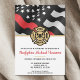 Dieses Design verfügt über eine Feuerwehrflagge mit schwarz-weißen Streifen und einen dünnen roten Streifen, der im Wind schwingt. Das Abzeichen eines Feuerwehrmanns liegt über allen Party-Details für den geschlossen Feuerwehrmann.