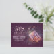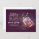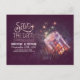 Spezielle und lila Save the Date Postkarte mit wunderschönem whimsicalem Maurerglas mit leuchtenden Lichtern - Glühwürmchen - Blitze. Moderne und Vintage Save the Date perfekt für rustikale Hochzeitsszenarien.