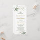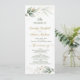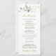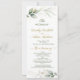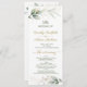 Elégante carte de programme de mariage avec feuillage vert et doré en aquarelle et confettis aux effets dorés.