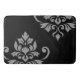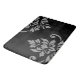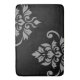 Vintag beeinflusster blüh, Scroll und Blattdämpfer in grauem Detail auf schwarzem Hintergrund.