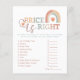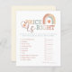Gardez les invités amusés avec cette feuille de baby shower arc-en-ciel boho! Doté d'un arc-en-ciel doux aux tons chauds et terreux, cette carte de jeu magnifiquement conçue est idéale pour les baby showers à thème neutre ou boho. Une façon amusante et coordonnée d'engager vos invités tout en célébrant les futurs parents.