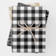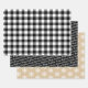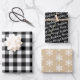 Le jeu d'enveloppes cadeau rustique moderne comprend trois feuilles de papier d'emballage de vacances coordonnés : plaid de buffle noir et blanc, texte noir avec script blanc "Joyeux Noël", et kraft brun tan avec motif de flocons d'hiver blanc.