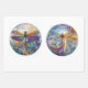 The image features two circular designs with vibrant and intricate dragonflies. The left design displays a pastel color scheme with shades of yellow, blue, and purple, while the right design showcases vibrant hues of blue, purple, and orange. Both designs are surrounded by flowers and foliage, creating an enchanting and dynamic scene.
