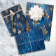 Elégante collection de papier d'emballage de Noël de luxe de 3 feuilles. La feuille 1 a des feuilles d'or sur un arrière - plan rayé bleu. La feuille 2 a des feuilles d'or sur le bleu métallique, et la feuille 3 a des feuilles bleu métallique sur un bleu marine irisé.