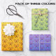 Ce sont des feuilles de papier d'emballage colorées et lumineuses avec un thème de tennis. Les draps ont un motif de raquettes et de boules de tennis sur un arrière - plan à l'ombre : Des raquettes rouges sur jaune/orange, des raquettes bleues sur jaune/vert et des raquettes roses sur rose/bleu.