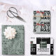 Un papier d'emballage graphique graphique en noir et blanc. Joyeux Noël écrit dans une viriaty de script et de style de police. Avec un contraste de noir et blanc et des détails en rouge et vert.