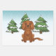 Destei's original cartoon illustration of a cute rute by color Cavalier breed dog. Le dog is placed a scene en hiver. Dans le scene it is snowing in the background and there are three green fir trees behind the dog. The trees have some snow on them. The background is a light blue to white gradient giving this design that freezing cold winter look.
