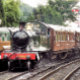 Un train à vapeur magnifiquement restauré et des chariots d'une époque révolue arrivent à la gare. Angleterre Royaume-Uni.