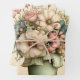 Wrapping paper sheets with a cute image. Blue. pink and cream colored flowers with green leaves. Set inside a green flower pot with a green plaid cloth hanging over the side.