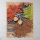 La photo mise en scène de feuilles de couleur automne entoure deux petits coeurs. Les feuilles sont faits d'un matériau en jute et donnent une texture ajoutée à l'oeuvre. La photo originale est masquée pour ajouter encore plus de variété avec un arrière - plan bronzé.