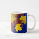 Une tasse à café blanche avec un collage de feuilles d'automne colorées sur un arrière - plan bleu profond.