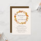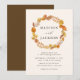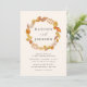 Invitations mariages de automne élégantes et rustiques avec une couronne de feuilles d'automne chaudes entourant vos noms avec vos détails mariages affichés ci-dessous. L'envers de l'invitation présente une couleur arrière - plan marron foncé contrastée.