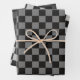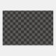 Un trio de feuilles de papier d'emballage noir et gris. Il y a une feuille de papier d'emballage gris clair et noir, une feuille de papier d'emballage à damiers noir et gris et une feuille de papier d'emballage gris foncé et noir. Veuillez voir toutes les photos.