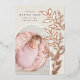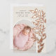 Faire-part de naissance chic et moderne, avec une seule photo verticale/portrait en forme d'arche, avec des vignes d'escalades de feuilles botaniques roses en feuille d'or sur le côté droit. Personnalisez avec le nom de votre bébé, la date de naissance et les statistiques, et ajoutez un message personnel au dos, ainsi qu'une photo supplémentaire.