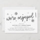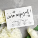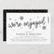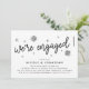 Les invitations modernes en noir et blanc à la fête d'engagement comportent "nous sommes fiancés !" en noir écrit à la main, des lettres écrites au moyen de lettres entourées de feux d'artifice éclatants et d'étoiles dessinées à la main. Personnalisez avec les détails de votre fiançailles sous le lettrage noir moderne.