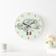 An unusual and colorful wall clock for a classic car enthusiast. On the face is a Fiat 600 and an Italian flag. This would make an ideal gift for someone and would be great in an Italian restaurant.