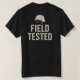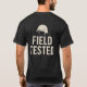 Clean sans-serif font “Field Tested” with a subtle distressed effect along the letter edges. A single vintage helmet icon sits above the phrase, set on a pure black background with no extra clutter.
