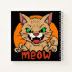 Eine bedrohliche Katze mit leuchtenden Augen, scharfen Zähnen und großen Krallen wird in einer dunklen und unheimlichen Umgebung gefangen. Sein Pelz bristelt, während es ein kühnes "Meow" lasse, das sowohl Fruchtbarkeit als auch Mystik verkörpert. Schatten und eine gesellige Atmosphäre verstärken die erschreckende Präsenz.