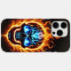 Der in leuchtorange und blau Flammen eingestrahlte Schädel strahlt Power und Zerstörung aus. Die leuchtenden Augen fügen einen intensiven übernatürlichen Effekt hinzu, der es zu einer auffallenden Darstellung von Chaos und Energie macht.