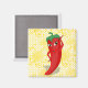 Ein roter und scharfer Pfefferkarikaturencharakter. Originelles Design mit goldenem (gelbem Druck) Spitzenmuster im Hintergrund. Benutzerdefinierte Magnete. Dekoration für alle Fische, die Sie sich vorstellen können! Geschenkidee für würzige Fressliebhaber.