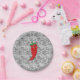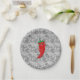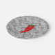 Ein roter und scharfer Pfefferkarikaturencharakter. Originelles Design mit schwarz-weißem Spitzenmuster im Hintergrund. Teller für kundenspezifisches Papier. Dekoration für alle Fische, die Sie sich vorstellen können! Geschenkidee für würzige Fressliebhaber.