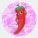 Ein roter und scharfer Pfefferkarikaturencharakter. Originelles Design mit rosa Spitzen-Muster im Hintergrund. Eigene Aufkleber. Dekoration für alle Fische, die Sie sich vorstellen können! Geschenkidee für würzige Fressliebhaber.
